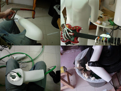 After cutting the right elbow, I inserted pipes for the control wires going from the control board to the hands and casted whipped polyurethane to make it permanent.